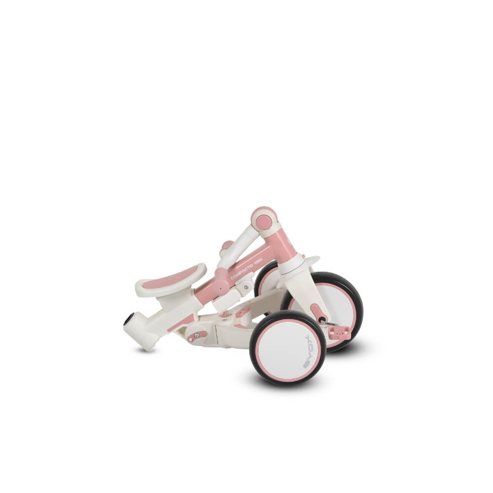 Compacto ima četiri jasno definisane faze korišćenja. Prvo je tricikl sa roditeljskom ručkom, gde odrasli imaju potpunu kontrolu nad pravcem i brzinom. Zatim dolazi faza sa manjim sedištem i bez baldahina, gde dete dobija više slobode. Treći korak je samostalna vožnja bez ručke, a završna faza – balans bicikl – pomaže razvoju ravnoteže i koordinacije.