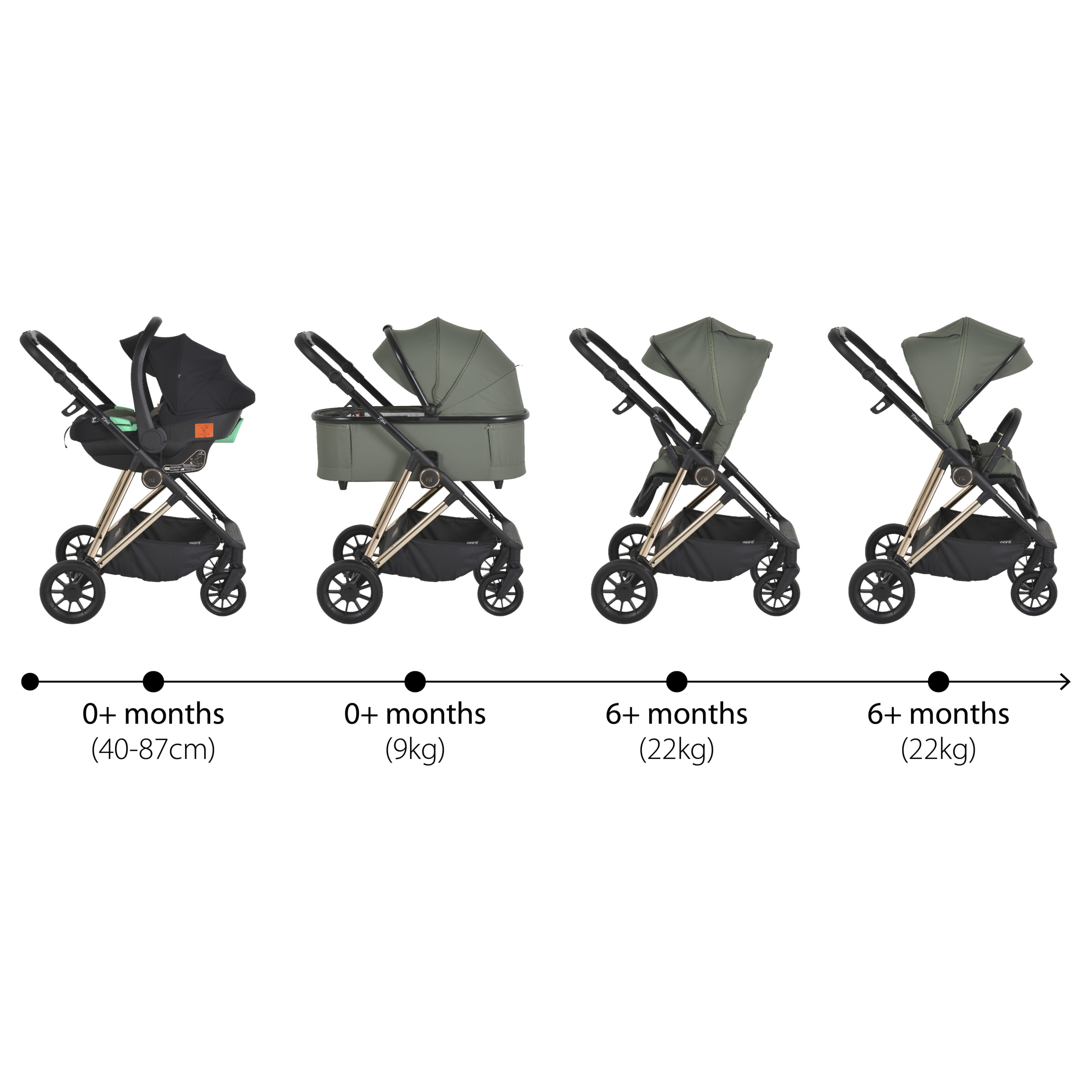 Ovaj 3 u 1 sistem uključuje šasiju, nosiljku za novorođenče, sportsko sedište i i-SIZE auto sedište (40–87 cm), kao i dodatnu opremu koja pokriva svakodnevne potrebe. Na taj način, ne morate posebno kupovati dodatne delove – sve je već usklađeno i spremno za korišćenje.