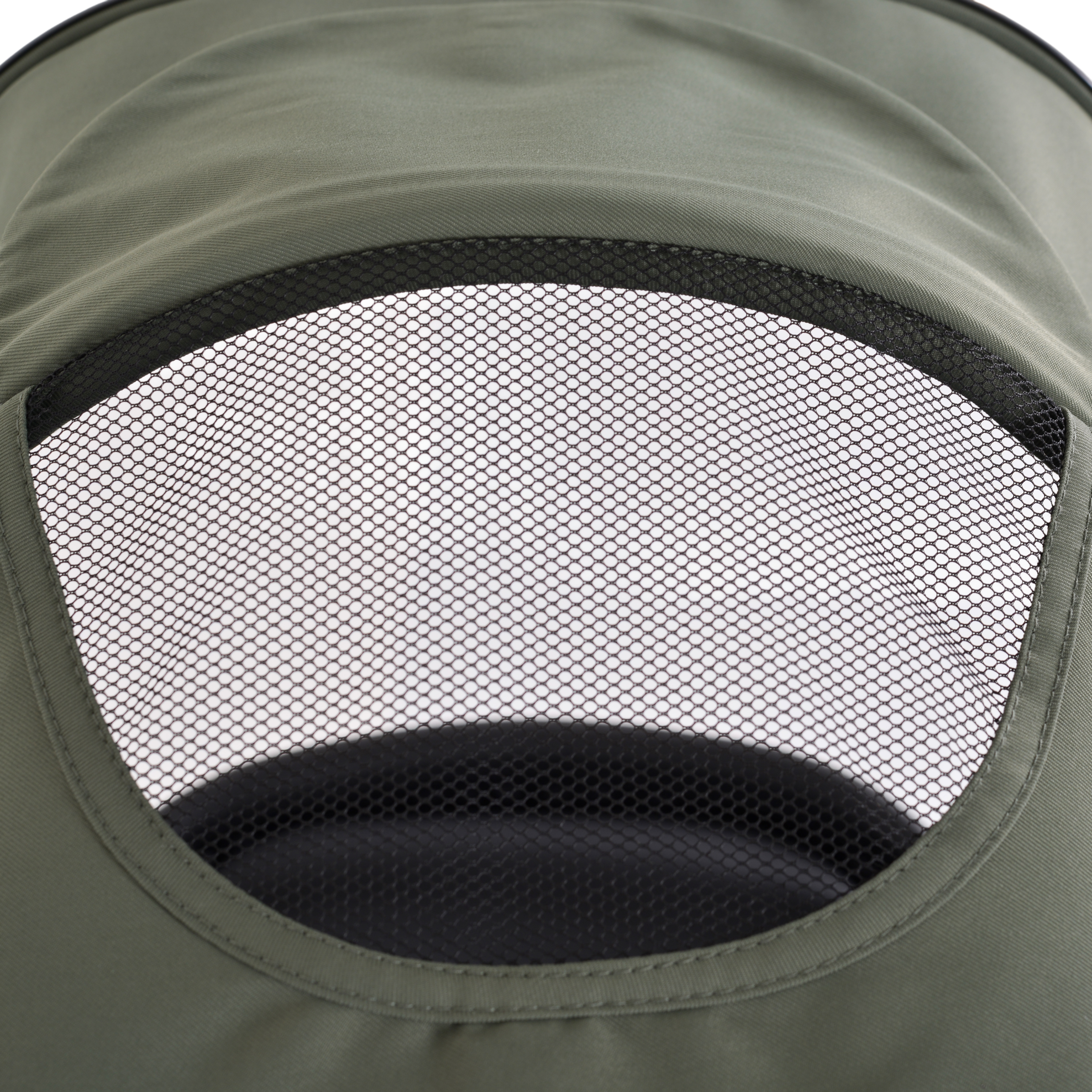 Veliki vodootporni krov sa UV50+ zaštitom, tri segmenta, dodatnim vizirima i mrežastim delom štiti dete od sunca, vetra i obezbeđuje ventilaciju.
