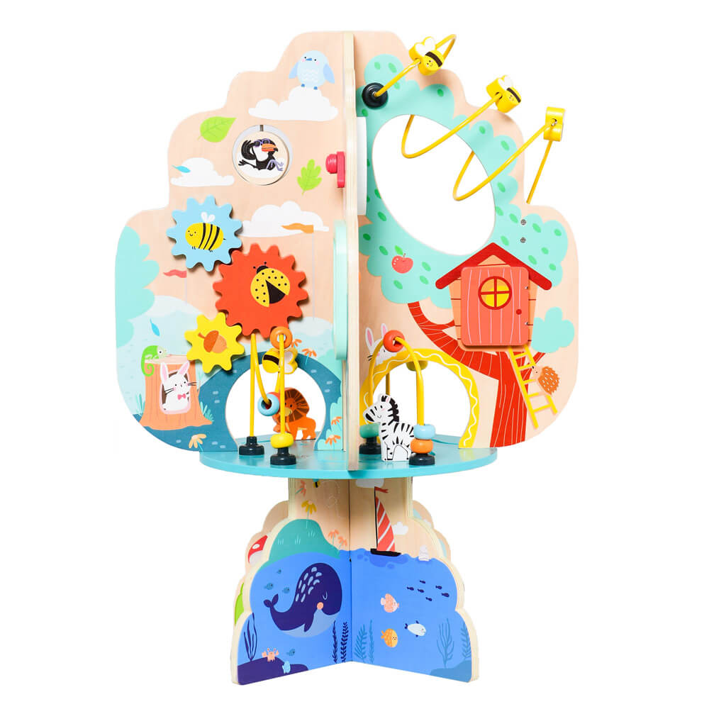Ovo drvo aktivnosti izrađeno je od masivnog drveta, obojeno netoksičnim bojama i pažljivo brušeno do glatkoće – da bude prijatno na dodir i potpuno sigurno za decu.